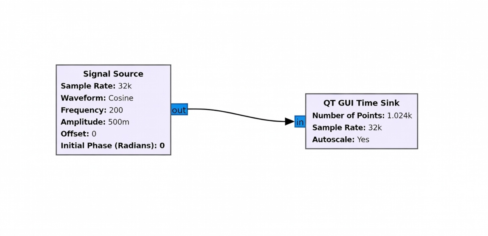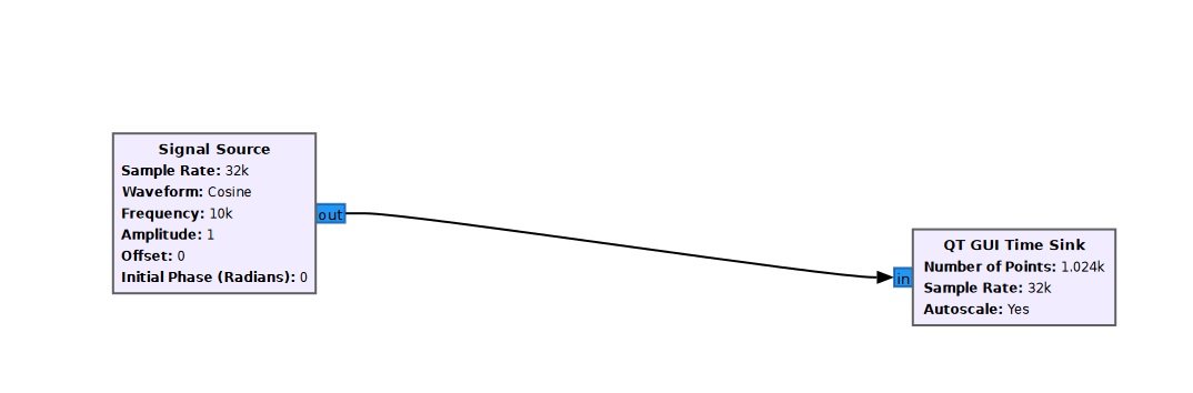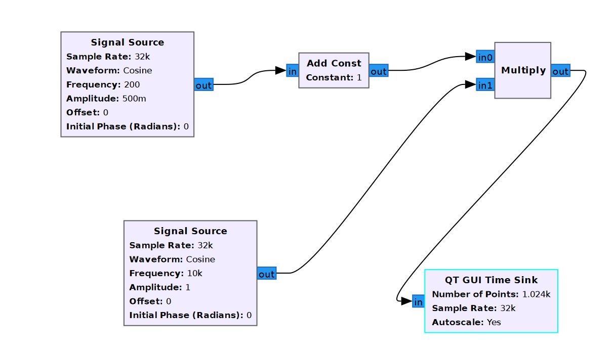 Dans GNU Radio, cette formule se traduit directement par l’assemblage de trois blocs simples.